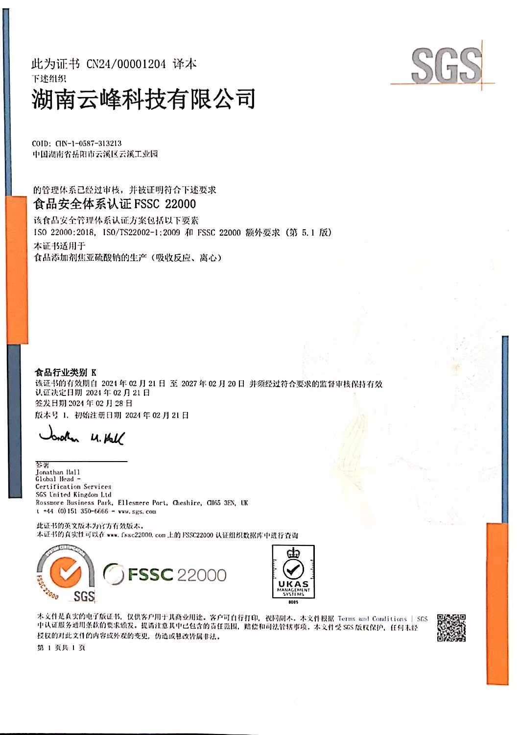 湖南云峰科技有限公司(以下簡稱云峰科技),是由長沙湘岳化工責任有限公司全額投資以生產焦亞硫酸鈉、亞硫酸鈉等亞硫酸鹽為主營業(yè)務的高科技企業(yè),具有六十多年的生產歷史,同時也是焦亞硫酸鈉的國家標準制定參與者。在行業(yè)內具有很大的影響力。現有職工八十余人。具有優(yōu)良的經營管理團隊和成熟的生產技術隊伍。由多位在化學、化工行業(yè)擁有豐富工作經驗的工程師及技術員團隊組建而成,致力于亞硫酸鹽產品的研發(fā)、生產和銷售。2020年公司對生產設備、安環(huán)設施及工業(yè)技術等進行了大規(guī)模的升級改造,使焦亞硫酸鈉和亞硫酸鈉的生產工藝更加先進,技術更成熟,產品質量更優(yōu)良。無論在生產工藝、設備、產品質量、清潔生產、節(jié)能環(huán)保和員工素質方面,均處于行業(yè)領先地位。公司的主導產品“云峰”牌焦亞硫酸鈉,歷史悠久,深受國內外客戶信賴,產品遠銷東南亞、歐美、非洲、南美洲等20多個國家和地區(qū),產品供不應求。